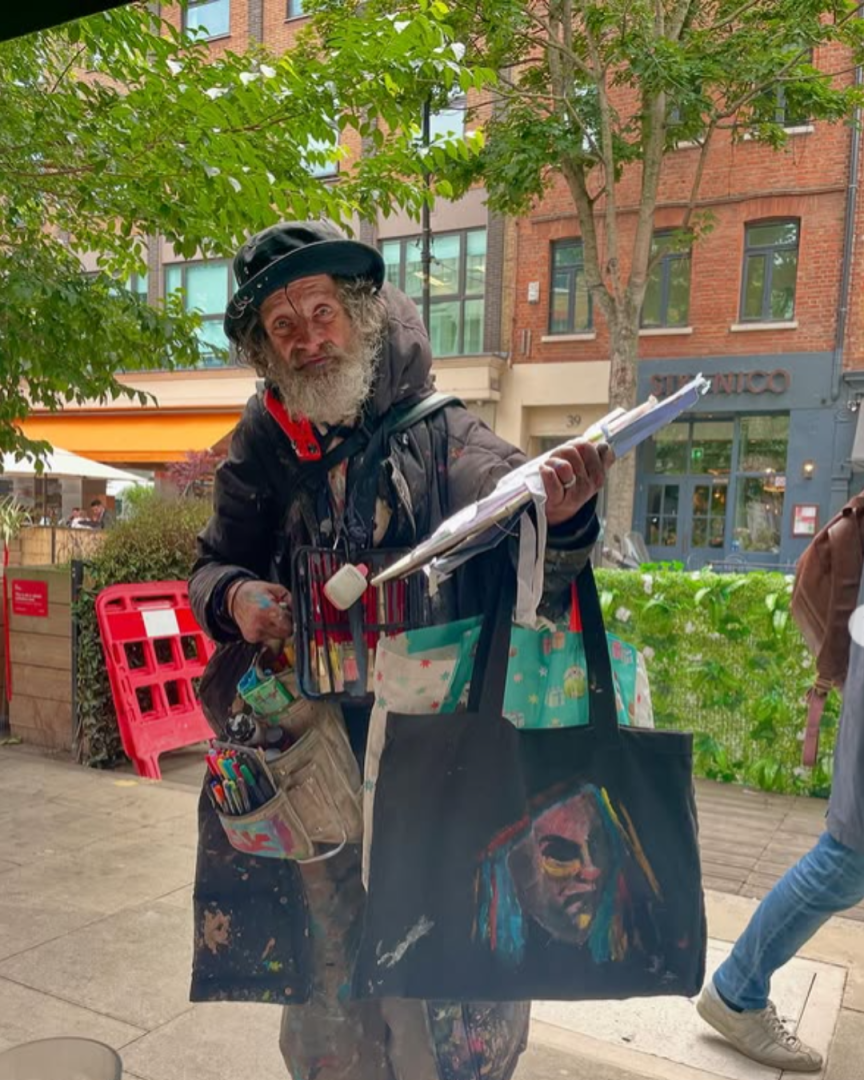 The London Art Exchange met Smurfy outside their London art gallery. He wasn’t asking for money — he was selling his art with a sign that read: