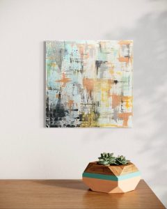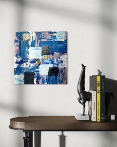 Eclipsed Moments unfolds in layered blues and soft blush tones, where bold squares emerge like fleeting shadows against light. The geometry feels both ordered and elusive, echoing the way memories overlap;— fragments of clarity veiled by silence. There is a quiet rhythm here, a conversation between presence and absence, as if the canvas holds time itself pausing to breathe.