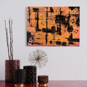 Urban Palette pulses with the heat of a city at dusk, where glowing orange skies collide with the grit of shadowed forms. The canvas hums with restless energy — structures rising, lights flickering, moments overlapping in a rhythm that never stops. Within its bold contrasts lies both the chaos and the beauty of urban life, a portrait of movement painted in texture and flame.