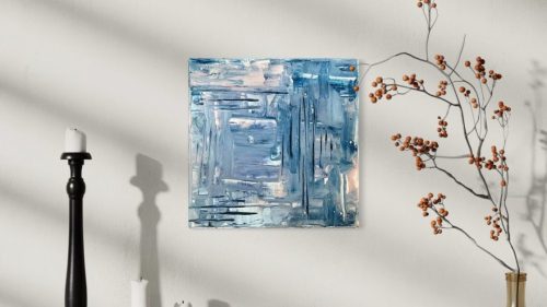 Silent Symphony drifts in layers of cool blue, whispering of quiet depths and the unseen movements beneath still waters. The brushstrokes create both tension and calm, like frozen echoes suspended in time. There’s a sense of solitude here, yet also harmony, a gentle dialogue between silence and sound, presence and absence. It invites the viewer to pause, breathe, and listen to the music that exists within stillness.